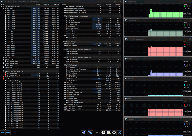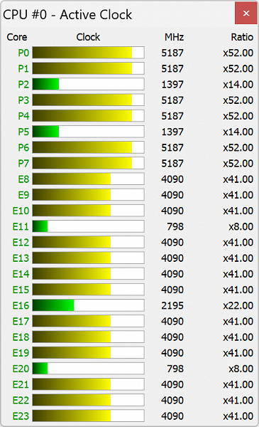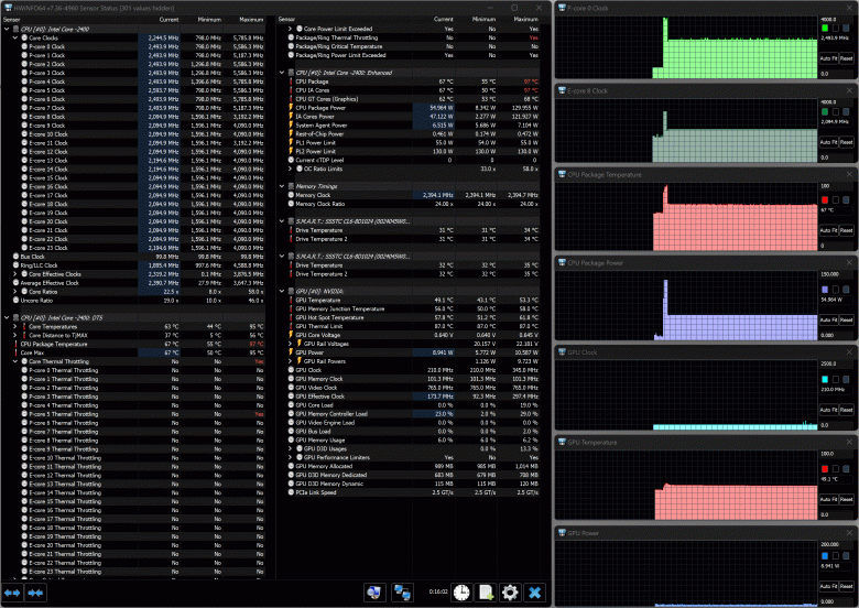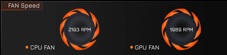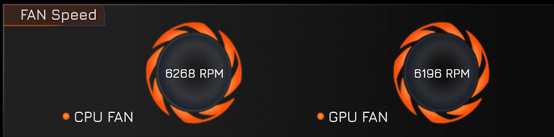 Изменение состояния вентиляторов отображается с существенной, до 10-15 секунд, задержкой. Можно увидеть, что минимальные скорости составляют около 2200 оборотов в минуту для CPU и 2000 для GPU, максимальные (по нажатию правой дальней кнопки) ближе к 6200-6300 об/мин.