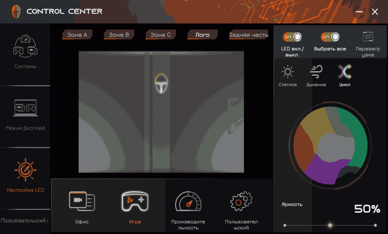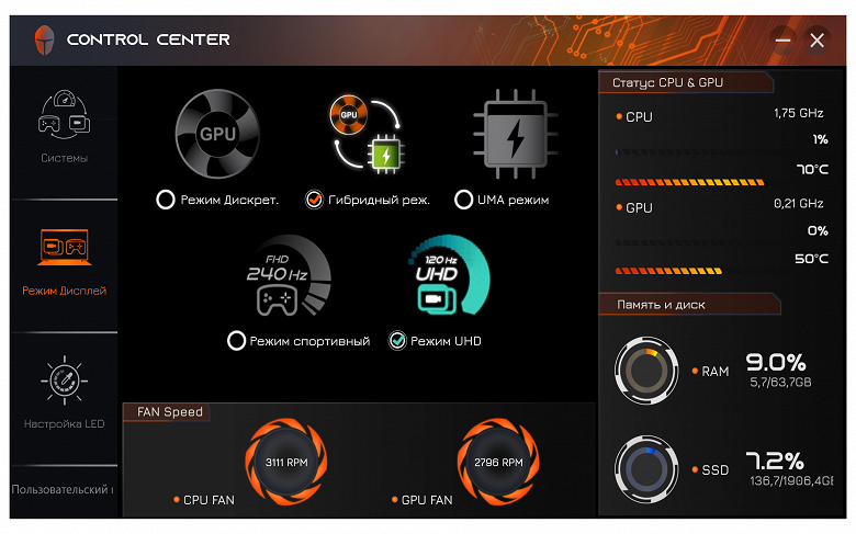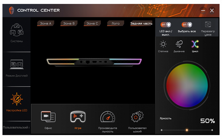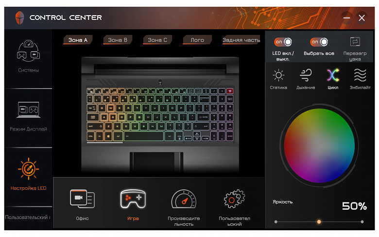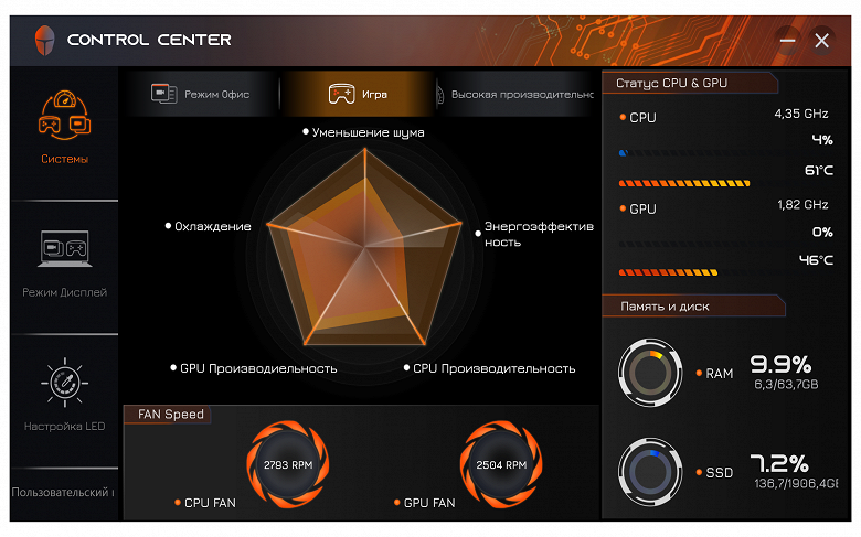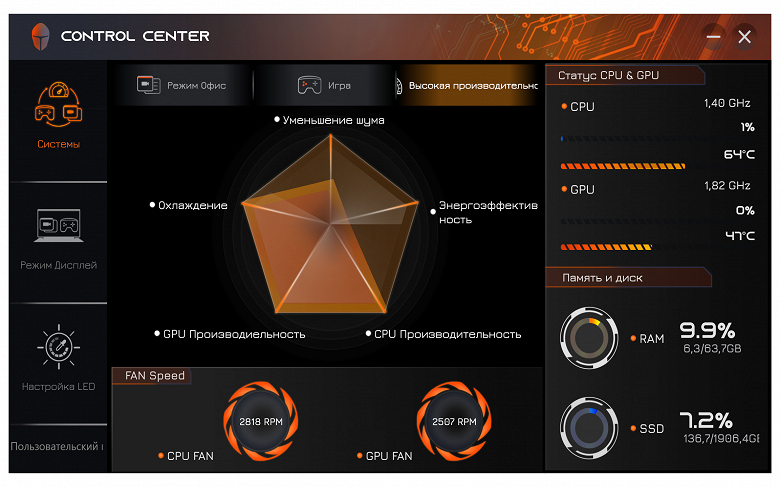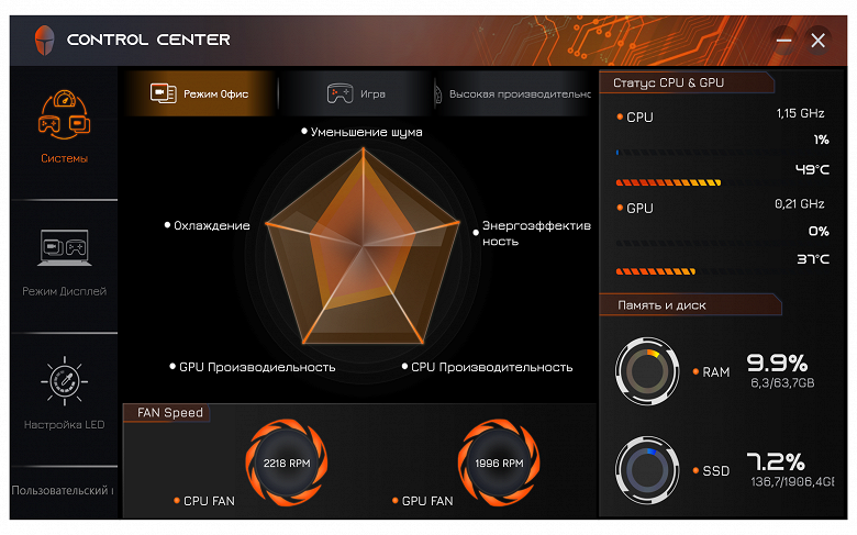 Утилита Control Center (в данном случае её издатель либо Leishen, если верить названию папки, в которую она установлена, либо Quanta Computer Inc – эта фирма обозначена в запросе системы безопасности при запуске утилиты, в ней самой чего-либо вроде "About" мы не нашли) нам знакома по другим рассмотренным ноутбукам Thunderobot, а одну из её функций – управление RGB-подсветкой – мы упоминали чуть выше. Кроме этого, реализованы минимальные функции мониторинга, включая отображение скоростей вращения вентиляторов (в других утилитах вроде AIDA64 их посмотреть нельзя), а также выбор одного из трёх профилей производительности: "Режим Офис/Office mode", "Игра/Gaming" или "Высокая производительность/High Performance".