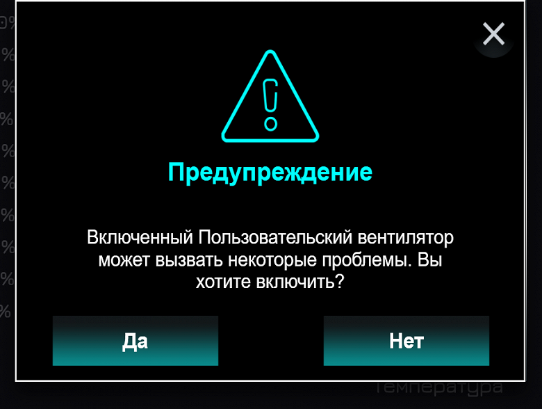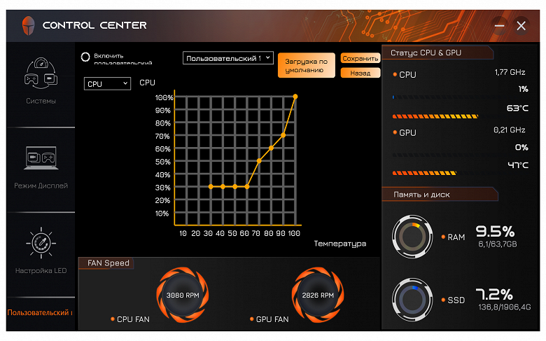 Для вентиляторов можно включить пользовательскую установку, задав раздельно для CPU и GPU вид кривых зависимости скорости вращения (в процентах от максимума) от температуры (в градусах Цельсия), а потом сохранить её для последующего вызова .