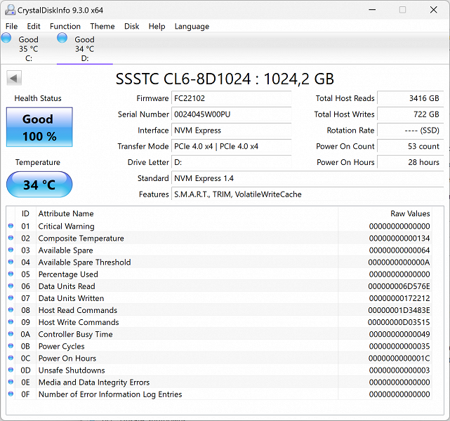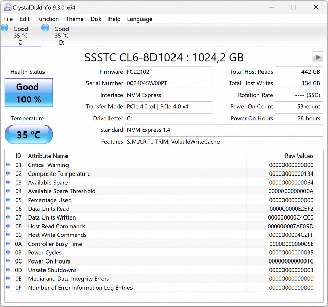 | Накопитель | 2 × SSD 1 ТБ SSSTC CL6-8D1024, M.2 2280, NVMe, PCIe 4.0 x 4 оба слота заняты | |