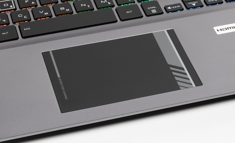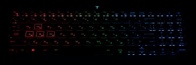 Для клавиатуры предусмотрена RGB-подсветка – отключаемая, с двумя уровнями яркости и тремя раздельно управляемыми зонами (с помощью утилиты Control Center, об этом ниже), на максимуме довольно яркая. Подсвечиваются и нанесённые символы, и края клавиш (но в меньшей степени).