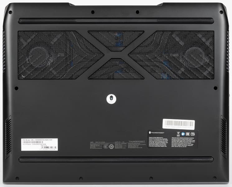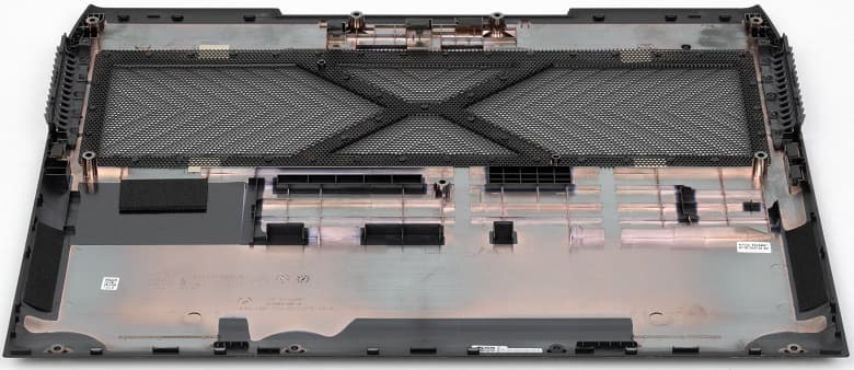 На днище, кроме вытянутых почти по всей длине ножек, ближе к задней кромке имеется область с закрытыми сеткой фигурными вырезами, через них происходит забор воздуха для охлаждения компонентов, поэтому ставить ноутбук на мягкую поверхность не следует.