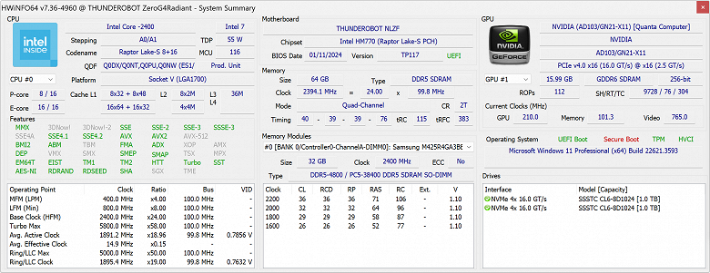 Thunderobot Zero G4 Radiant – вполне современный игровой ноутбук с одними из самых производительных на сегодняшний день процессором и дискретной видеокартой, 16-дюймовым экраном, богатым набором внешних портов, включающим Thunderbolt 4 и RJ-45 для проводной сети (причём разъёмы расположены вполне разумно, с трёх сторон корпуса), значительным объёмом оперативной памяти и двумя весьма производительными SSD по одному терабайту.