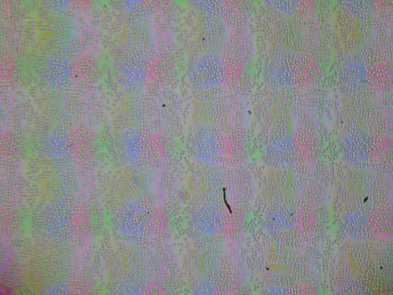 Зерно этих дефектов в несколько раз меньше размеров субпикселей (масштаб этих двух фотографий примерно одинаковый), поэтому фокусировка на микродефектах и «перескок» фокуса по субпикселям при изменении угла зрения выражены слабо, из-за этого нет и «кристаллического» эффекта.