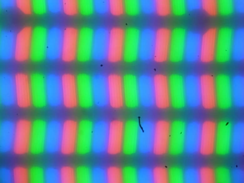 В этом ноутбуке используется матрица типа IPS. Микрофотографии демонстрируют типичную для IPS структуру субпикселей (черные точки — это пыль на матрице фотоаппарата):