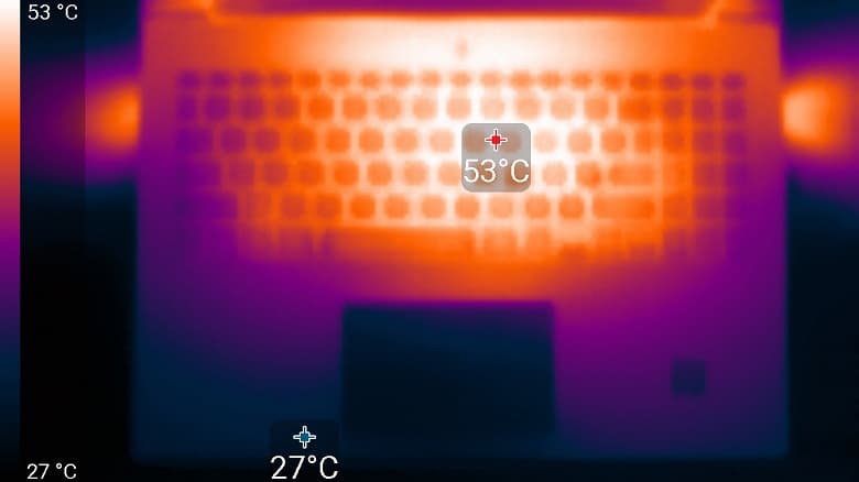 На верхней плоскости корпуса за клавиатурой имеется полоса с очень мелкими отверстиями, но это скорее элемент оформления. При длительных нагрузках, прежде всего в играх, эта часть сильно нагревается.