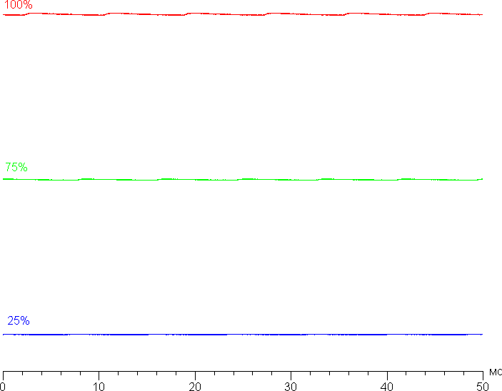 На любом уровне яркости значимая модуляция подсветки отсутствует, поэтому нет и никакого мерцания экрана (нет ШИМ). В доказательство приведем графики зависимости яркости (вертикальная ось) от времени (горизонтальная ось) при различных значениях настройки яркости: