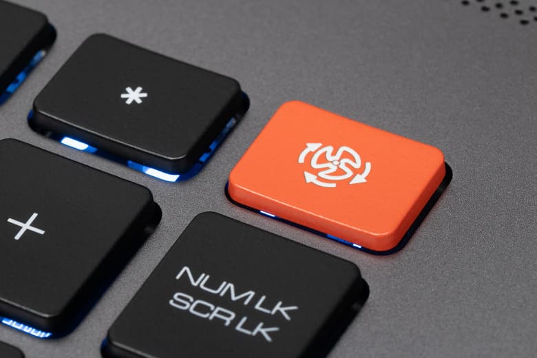 Правый дальний угол клавиатуры, где зачастую бывает расположена кнопка Power, занят совсем другой клавишей, которая принудительно включает вентиляторы на максимальную скорость (шум при этом получается соответствующий). Она выделена оранжевым цветом, повторное её нажатие возвращает автоматический режим управления вентиляторами.