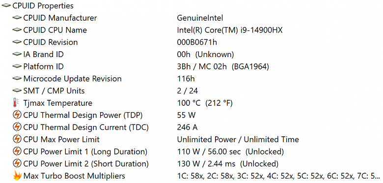 | Процессор | Intel Core i9-14900HX (8+16 ядер/32 потока, 2,2-5,8/1,6-4,1 ГГц, 45-55/157 Вт) | |