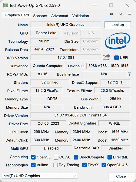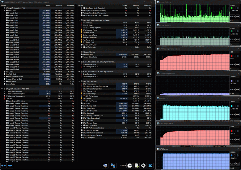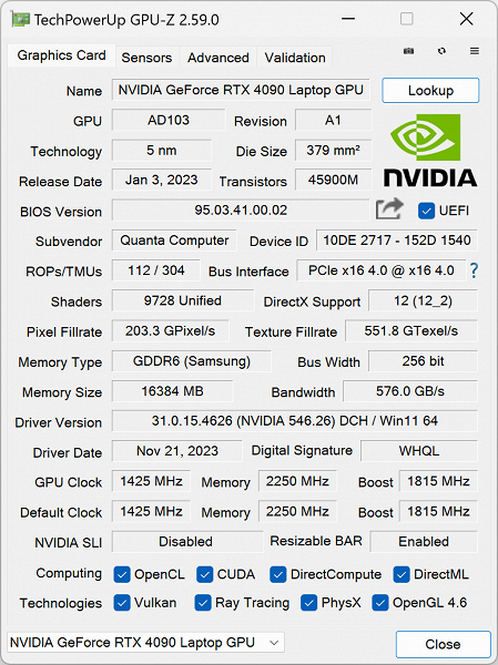 | Видеоподсистема | дискретная NVIDIA GeForce RTX 4090 Laptop (16GB GDDR6 175 Вт), интегрированная Intel UHD Graphics (32EU) | |
