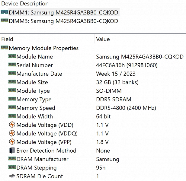 | Оперативная память | 64 (2×32) ГБ DDR5-4800 (2 × Samsung M425R4GA3BB0-CQKOD) оба слота SO-DIMM заняты | |