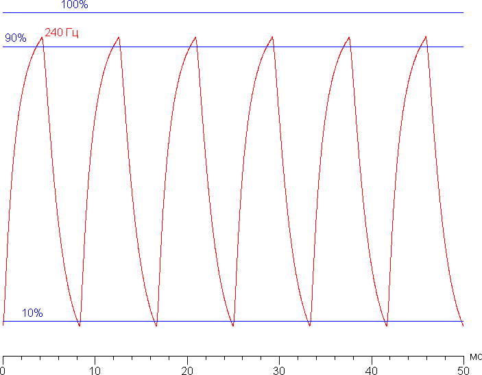 Посмотрим, хватит ли такой скорости матрицы для вывода изображения с частотой 240 Гц. Приведем зависимость яркости от времени при чередовании белого и черного кадра при 240 Гц кадровой частоты: