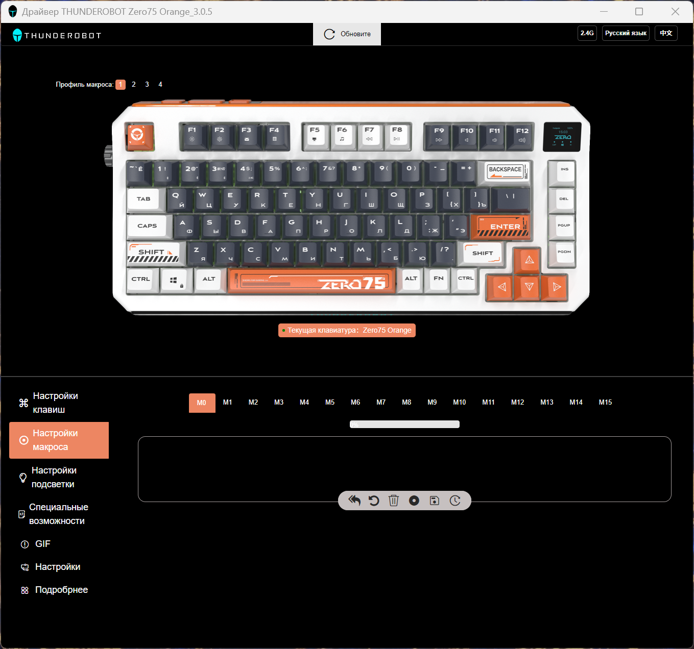 Редактор макросов тут также присутствует. Всего, как видно, их можно записать до 15 штук. Но, как правило, и этого количества вполне достаточно, ибо макросы на клавиатуре — это штука хоть и удобная, но очень редко применимая.