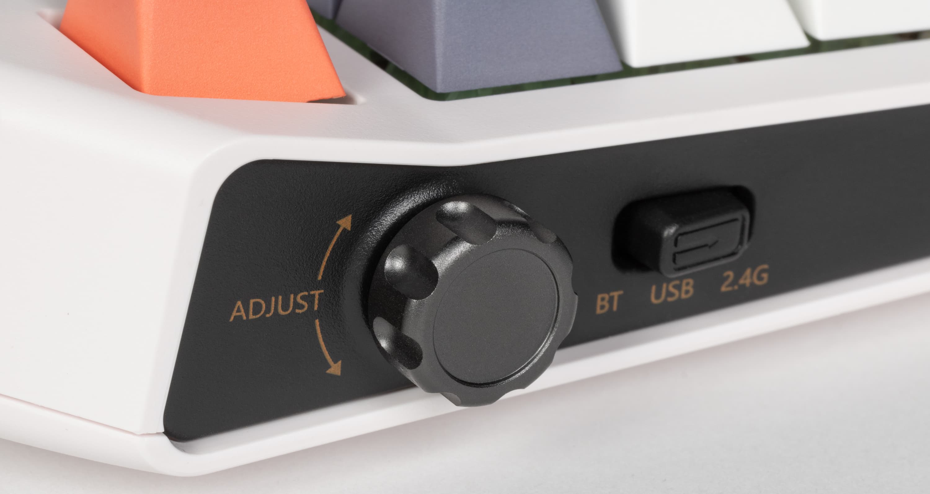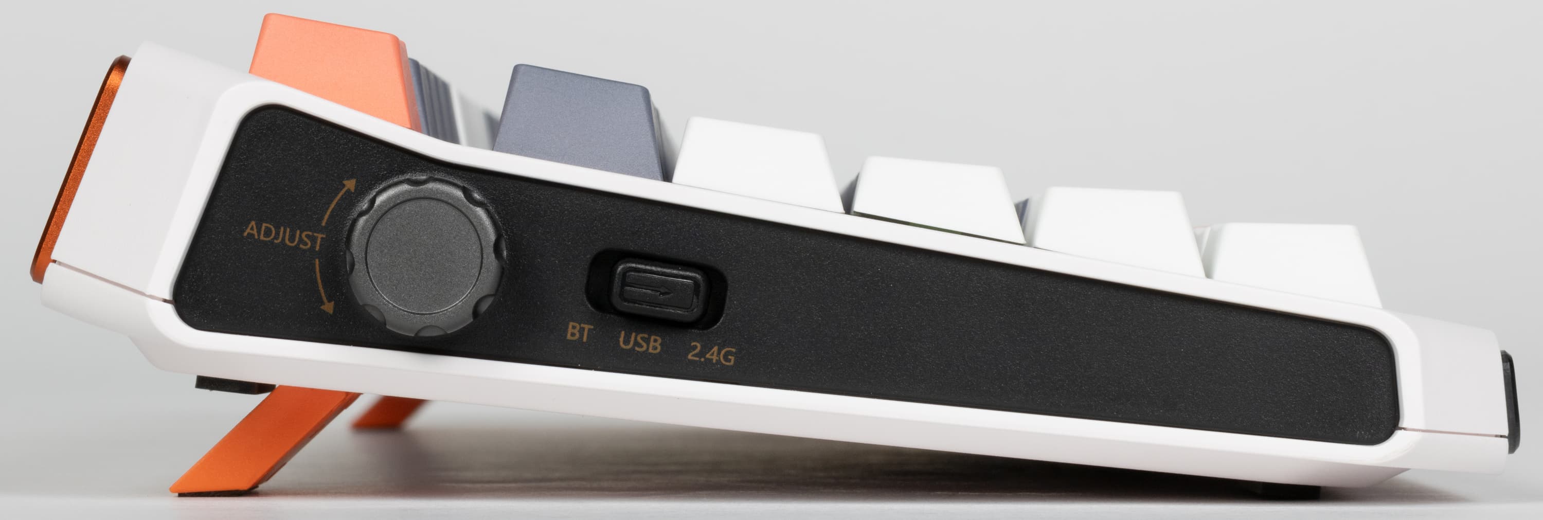 Рядом с колесом находится тумблер режимов подключения. Клавиатура может подключаться по кабелю, по радиоканалу на частоте 2,4 ГГц и по Bluetooth.