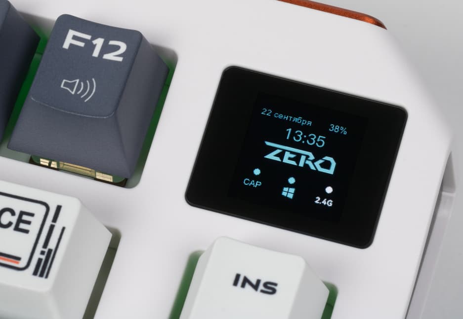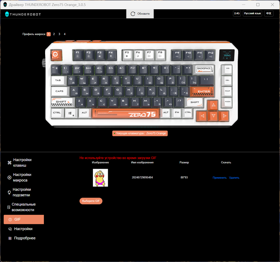 В правом верхнем углу — небольшой цветной дисплей. На него по умолчанию выводится дата и время, процент заряда батареи, информация о типе подключения и о том, включен ли Caps Lock. А еще на нём можно смотреть GIF-анимацию. В клавиатуре уже загружены две гифки. Одна — это реклама Thunderobot, а вторая — танцующий утёнок. Но есть возможность загрузить и что-то свое. Размер, правда, ограничен: 128х128 пикселей. Также на этом экранчике можно настроить подсветку клавиатуры (всего с его помощью настраивается 10 эффектов) или вывести на него секундомер. Вопрос о том, насколько это удобно и зачем вообще пользоваться секундомером на клавиатуре, оставим за рамками этого обзора.