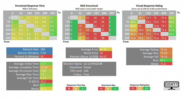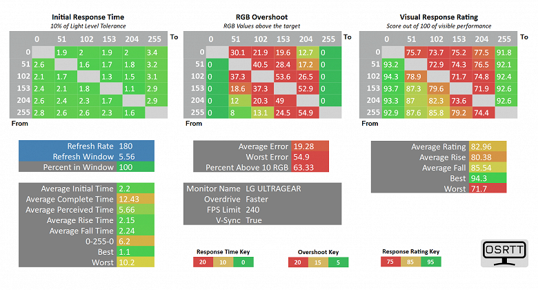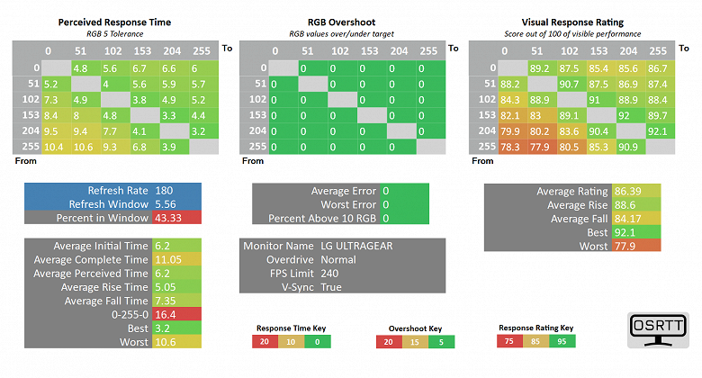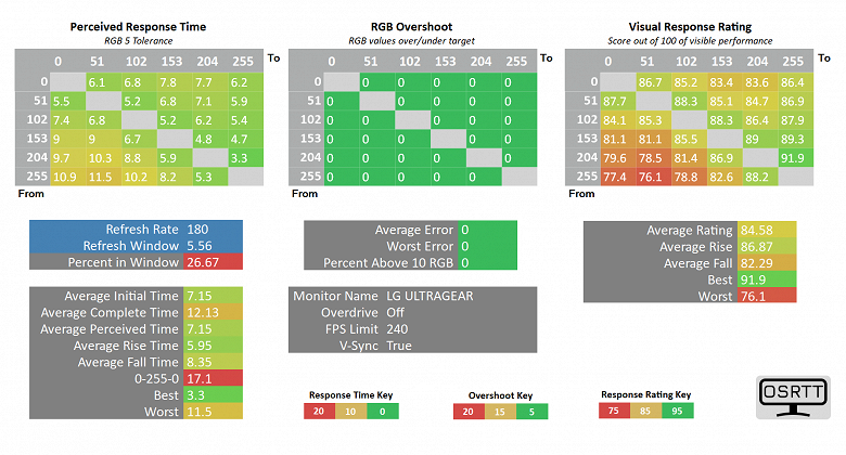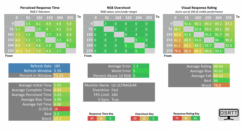Выше представлены результаты скорости отклика, уровня выявленных артефактов и "визуальный рейтинг скорости" (основан на данных о частоте развёртки и фактической скорости отлика для каждого проверенного цветового перехода). Для данного тестирования мы воспользовались рекомендованными производителем комплекса OSRTT Pro допусками – RGB 5 с нормализацией гаммы и выводом так называемого "воспринимаемого времени отклика" (Perceived Response Time), учитывающего наличие артефактов и их уровень.