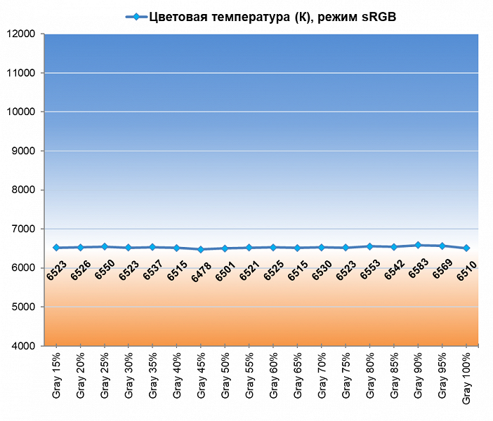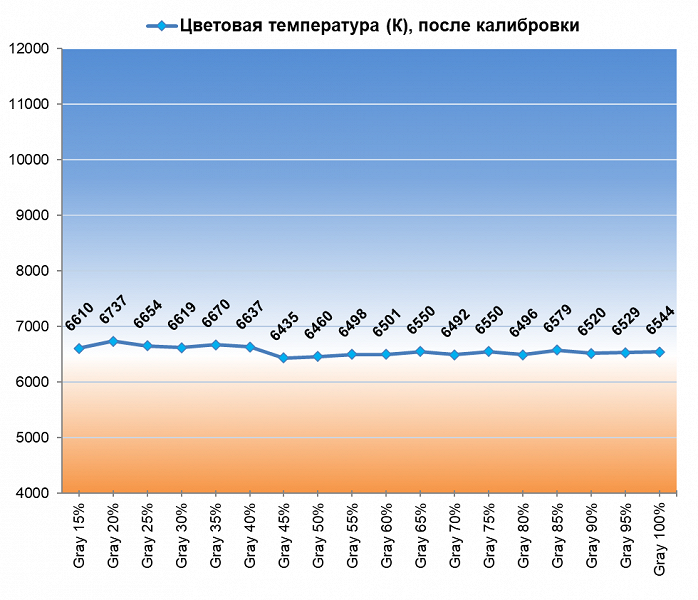 Наконец, среди предустановленных режимов цветовой температуры производитель выделил три основных режима и один пользовательский с настройками RGB 50/50/50 по умолчанию. Последний режим оказался фактически копией выставленного по умолчанию режима "Тёплый". Два оставшихся основных режима соответствуют своим названиям, но последний – "Холодный" – предлагает меньшую стабильность ЦТ оттенков серого, чем все остальные.