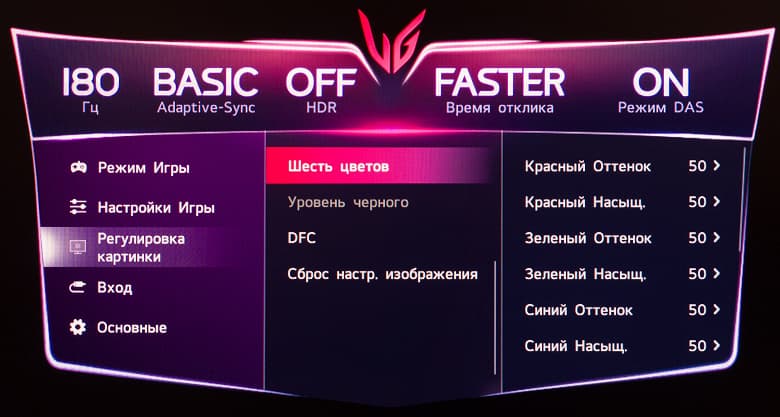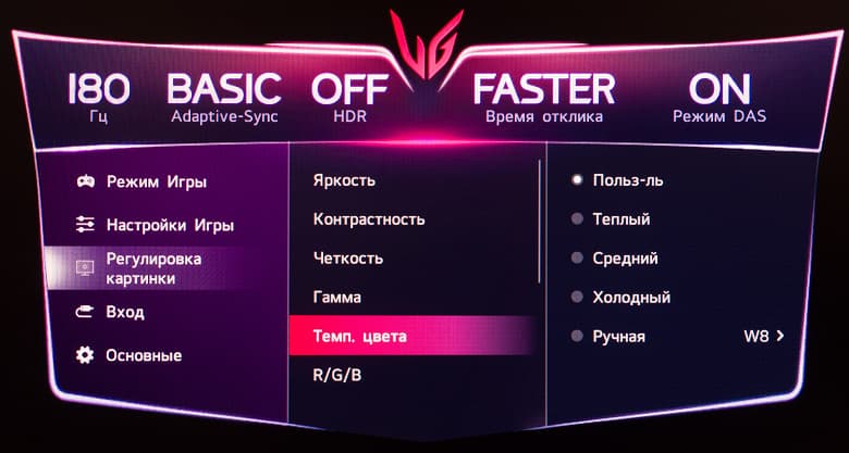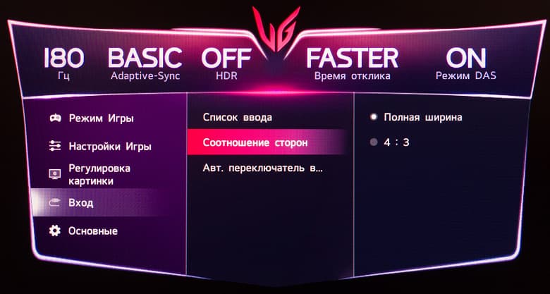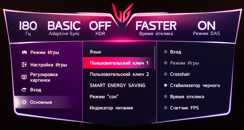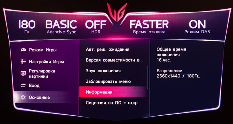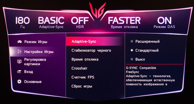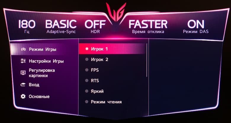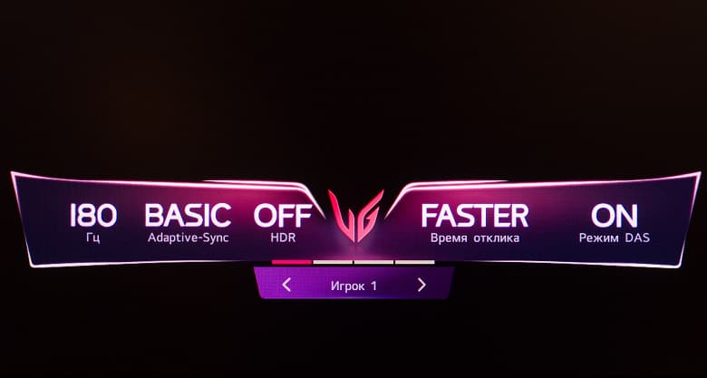 Для достижение 180 Гц активация какого-либо разгона частоты не требуется. Заявленное время отклика – базовые для большинства современных игровых решений 1 мс GtG, но с большими допусками (по стандарту VESA, 10%—90%) и только в режиме разгона панели "Быстрее" (Faster) – это официальное уточнение от самой LG, которое можно встретить на официальном сайте компании в описании к устройству.