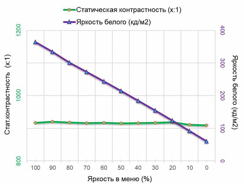 Монитор от LG продемонстрировал широкий диапазон регулировки яркости подсветки. Модель обеспечивает яркость от 60 до 365 нит, снижение яркости абсолютно линейно.