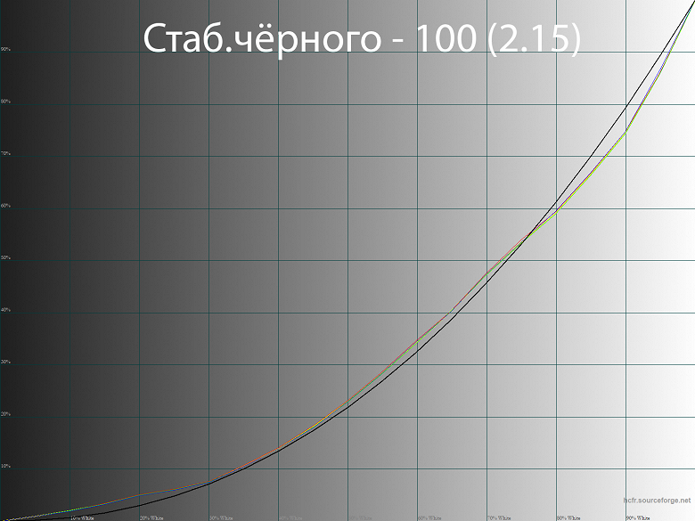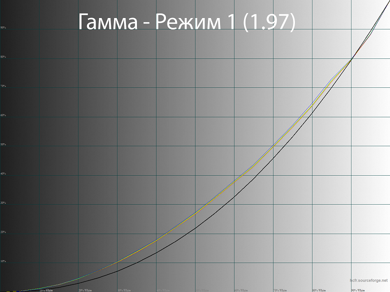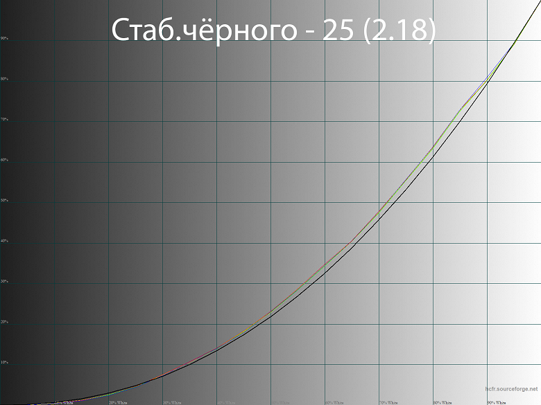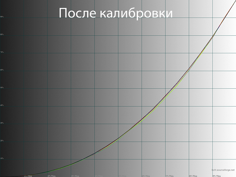 При заводских установках гаммы (режим Гамма 2.2) линии гамма-кривых проходят достаточно близко к референсу (чёрная жирная линия на графиках), дисбаланс RGB отсутствует, различимость глубоких теней достойная, общая контрастность слегка снижена. После калибровки с правками в LUT видеокарты изменения минимальны, в целом можно обойтись и без них, особенно если вам не важна максимальная точность цветопередачи в соответствующих областях (фото, видео, дизайн, графика).