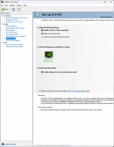 У модели есть полноценная поддержка всех необходимых для игроков функкций и технологий. Скорость используемой Nano IPS панели не вызывает нареканий, как и качество заводского уровня Overdrive (разгона скорости отклика). Можно пожаловаться на отсутствие режима вставки "чёрного кадра" (MBR в случае мониторов LG), но многие спокойно обойдутся и без него.