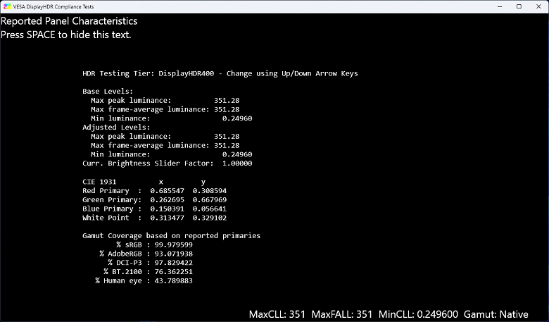 Для проверки HDR мы использовали известную и проверенную временем программу DisplayHDR test tool, которой предлагает пользоваться организация VESA для проверки соответствия устройств отображения критериям сертификатов.