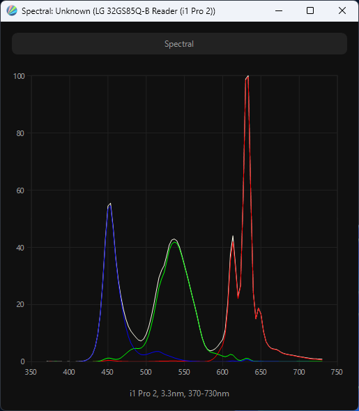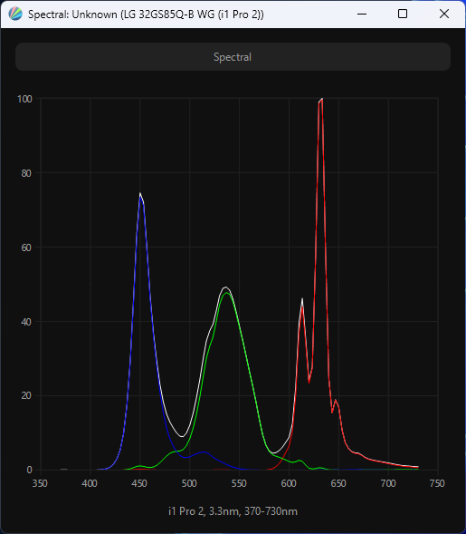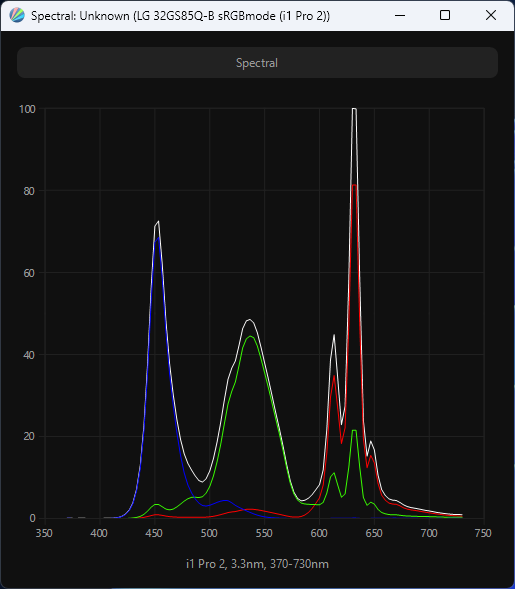 Виден пик синего, приходящийся на 450-452 нм – не очень современно с точки зрения снижения нагрузки на глаза, но типично для многих Nano IPS матриц от LG Display. Перекрестное подмешивание компонент незначительное. Полученный спектр подтверждает использование в системе подсветки так называемого PFS/KSF-слоя, в котором используется модификатор спектра в виде красного люминофора.