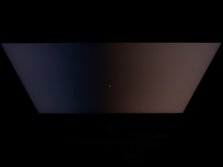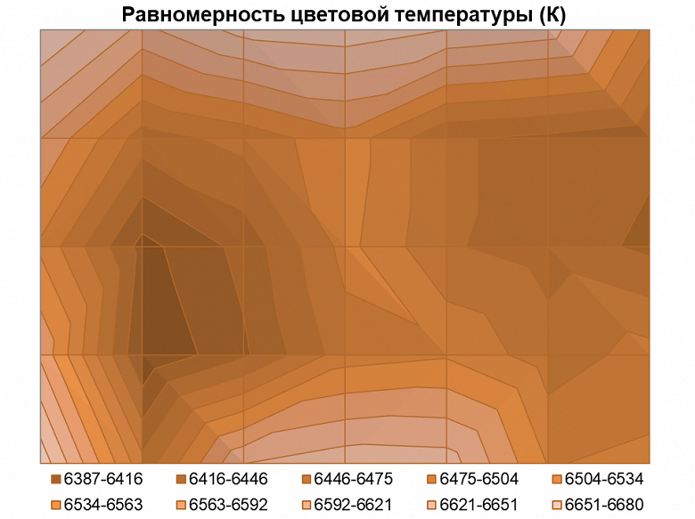 Выражено характерное снижение яркости от центра к краям экрана, но в основном только в правой части матрицы. Изменение цветовой температуры по рабочему полю матрицы минимальное, хотя оно, безусловно, присутствует.
