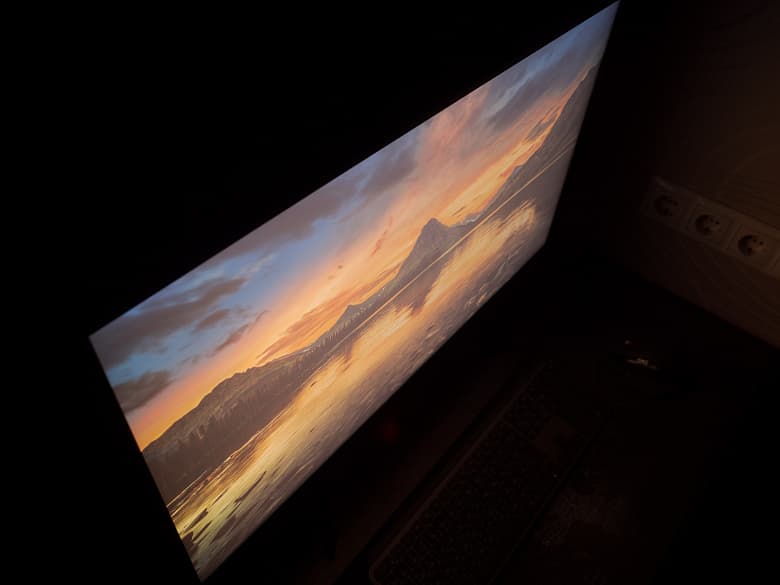 Наглядная демонстрация типичного для IPS Glow-эффекта представлена выше – на двух фотографиях. При диагональных углах просмотра изображение окутывает "пелена" с лёгким паразитным оттенком, отличающимся в зависимости от того, с какой стороны смотреть.