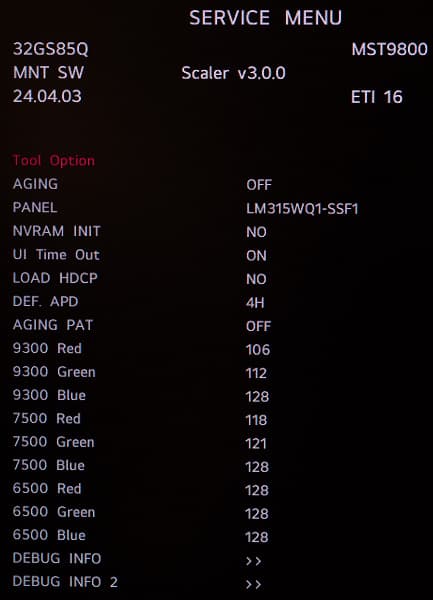 Благодаря полученному доступу в сервисное меню монитора, мы получили подтверждение информации об используемой в мониторе матрицы, версии и модели скалера, версии прошивки, а также различные данные по значениям RGB для трёх режимов цветовой температуры. Менять доступные настройки, без знаний что к чему – мы не рекомендуем. Можете сделать только хуже или вовсе лишиться гарантии.