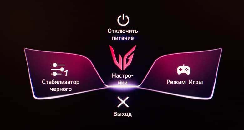 Нажатие джойстика проводит к появлению на экране красочно выполненного, анимированного OSD-меню с пятью пиктограммами. Через них можно попасть в основное меню, выбрать источник сигнала, активировать игровые настройки (открывается подменю), выключить монитор и убрать меню.