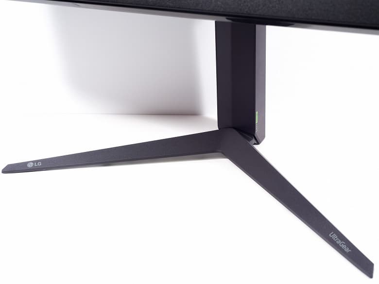 Глянцевый пластик по контуру корпуса всё ещё с нами, но в качестве нижней накладки экрана используется матовая вставка с почти чёрным логотипом UltraGear. Общее же качество сборки монитора мы оцениваем как высокое: подгонка деталей на вызывает нареканий, покраска равномерная, корпус плотно сбит.