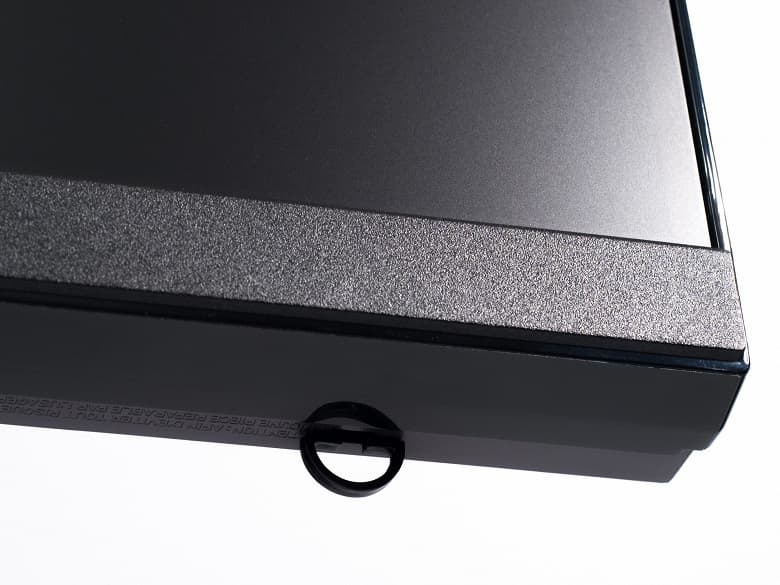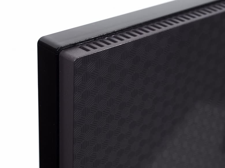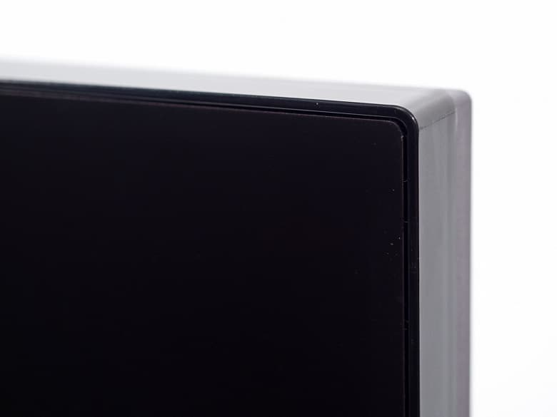 Лицевая сторона матрицы имеет черную полуматовую поверхность с выраженной зеркальностью и жестким внешним слоем. Внешне экран представляет собой монолитную поверхность, ограниченную узкой рамкой по краям и неширокой планкой в нижней части. Однако, при выводе изображения становится заметно, что между видимыми краями экрана и областью отображения остаются небольшие поля – нерабочие зоны панели, как и у всех псевдо-безрамочных дисплеев.