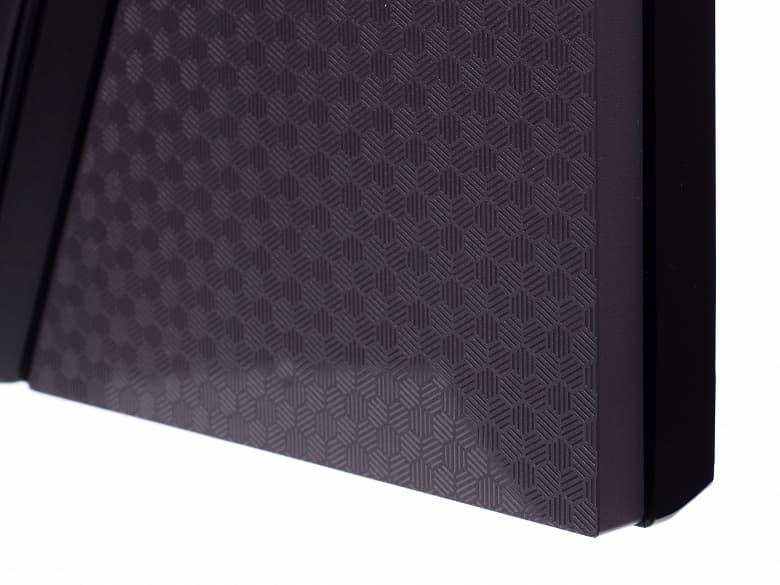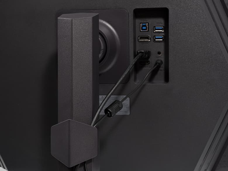 В новом поколении мониторов LG производитель ушёл от использования ярких штрихов в виде красных декоративных элементов, добавил полуглянцевый «ромбовидный принт», а утолщение корпуса из более практичного полуматового пластика выполнено в виде шестиугольника с зонами для установки внешней подсветки Hexagon Lighting RGB, которая в новинке 32GS85Q-B не используется.