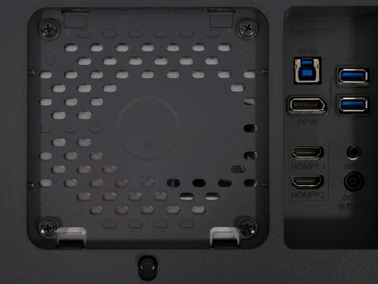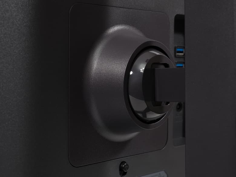 Центральная колонна стыкуется с корпусом монитора буквально за секунды. Внешний шарнир выполнен из глянца, а VESA-совместимое крепление стандарта 100х100 мм углублено в корпус. Для разъединения подставки и корпуса необходимо отвести пластиковый рычажок вниз.