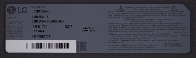 Под зоной VESA-крепления находится информационная наклейка, по которой можно уточнить точное название решения, его серийный номер, требования по питанию, место (Китай) и время (июль 2024 года) производства, класс матрицы (третий), ревизию устройства (Rev.04).
