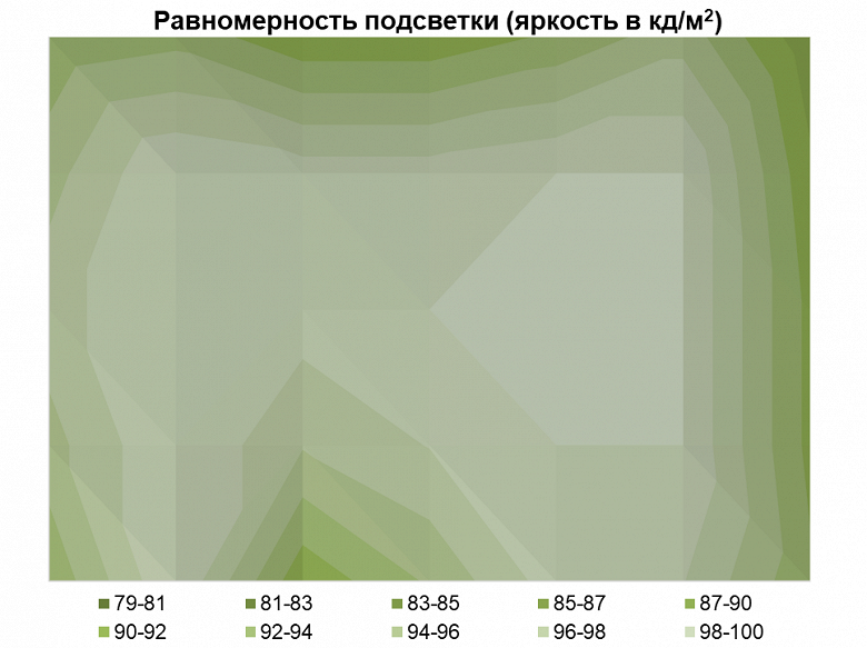 Измерения яркости проводились в 35 точках экрана, расположенных с шагом 1/6 от ширины и высоты экрана. Границы экрана не включены, настройки установлены в значения, обеспечивающие яркость белого поля в 100 нит и точку белого приближённую к 6500К в центральной части экрана.