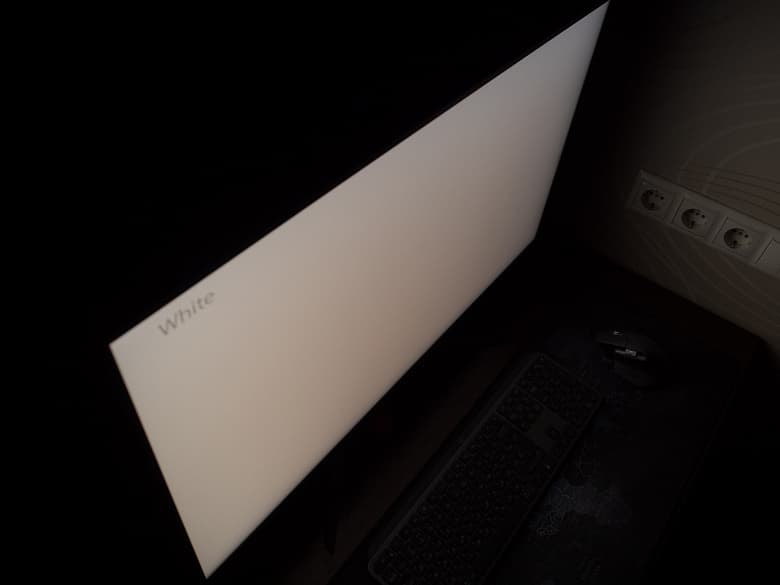 В подобных условиях проверки белое поле также меняет свой вид, приобретая лёгкий металлический отлив и резко снижая свою визуальную яркость. Дополнительно проявляются паразитные оттенки в разных участках экрана.