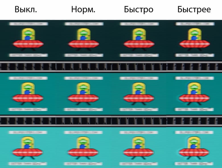 Видно, что при прочих равных условиях четкость изображения слегка повышается по мере перехода к всё более быстрым режимам "Скорости отклика". По умолчанию производитель использует вариант "Быстро" и именно он, с точки зрения автора, является наиболее удачным по соотношению скорость-чёткость-видимость артефактов.