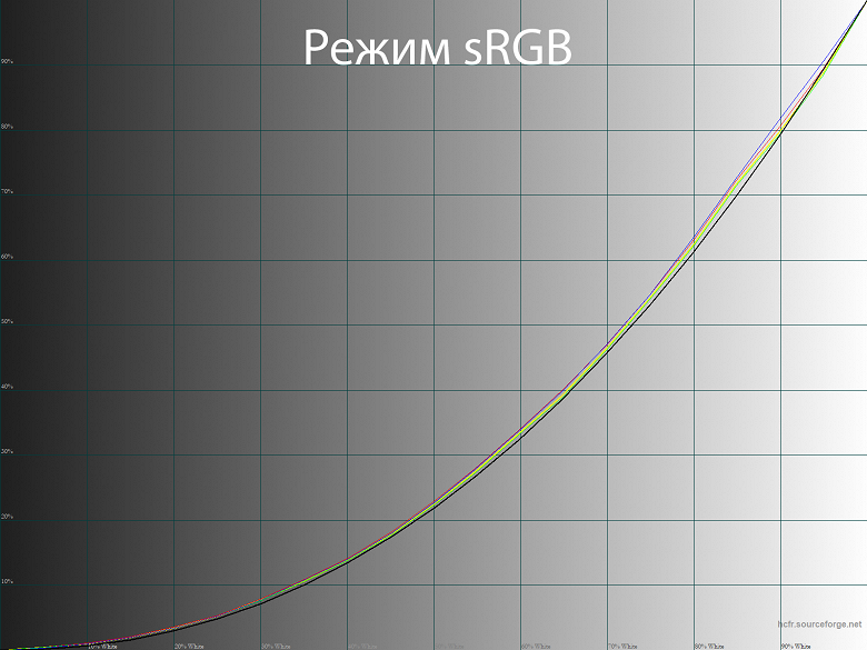 Что касается режима эмуляции sRGB, то в нём гамма-кривые выставлены максимально точно к соответствующему референсу – приподнята различимость в тенях и слегка высветлены светлые полутона. Снижается цветовая насыщенность, цвета отображаются очень корректно, яркость и цветовая температура доступны для регулировки. Режим настроен почти идеально, заводская яркость находится на уровне близком к 120 нит, а поэтому данный пресет может использоваться "из коробки" без дополнительной ручной настройки.