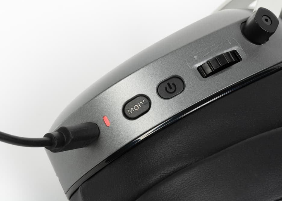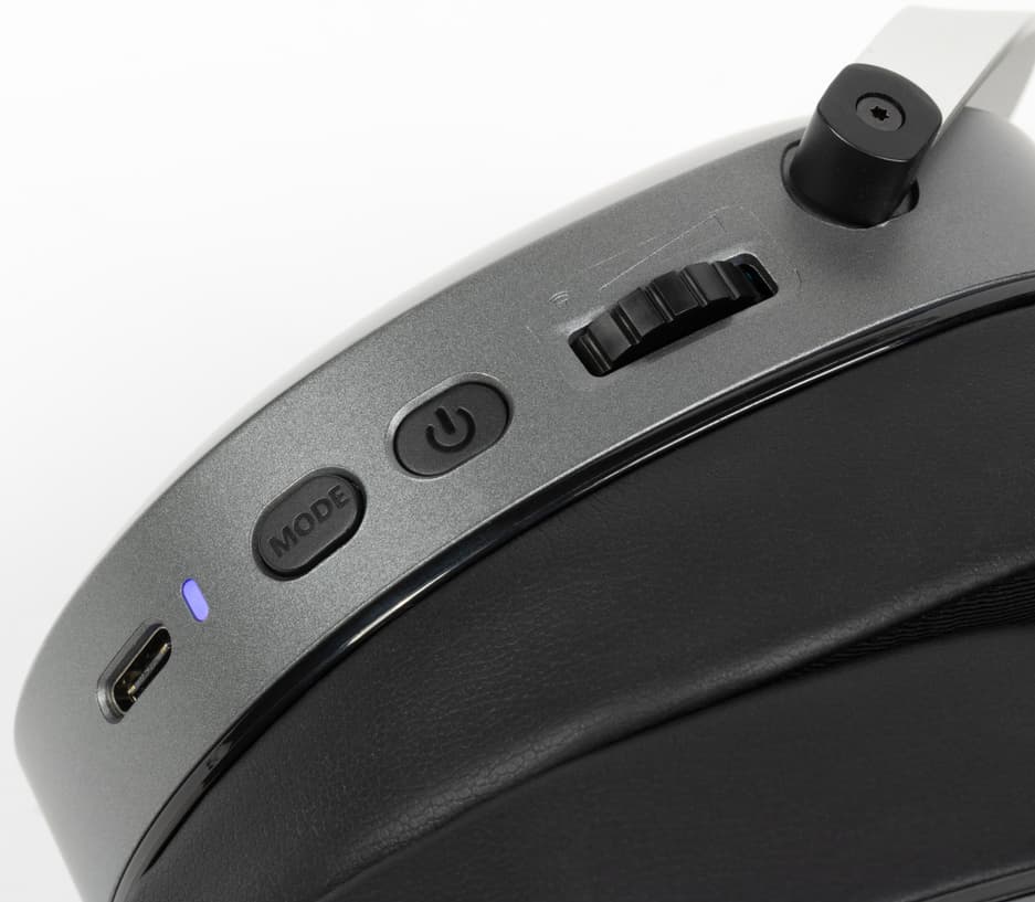 Все элементы управления находятся на левой чашке и удобно ложатся под большой палец левой руки.Рядом с кнопкой «Power», которая чуть утоплена в корпус, есть переключатель режимов, который наоборот выступает наружу. Их легко отличить на ощупь. Долгое нажатие кнопки «Mode» меняет режим подключения: можно оставить ресивер в компьютере, а по Bluetooth подключиться к телефону или планшету.