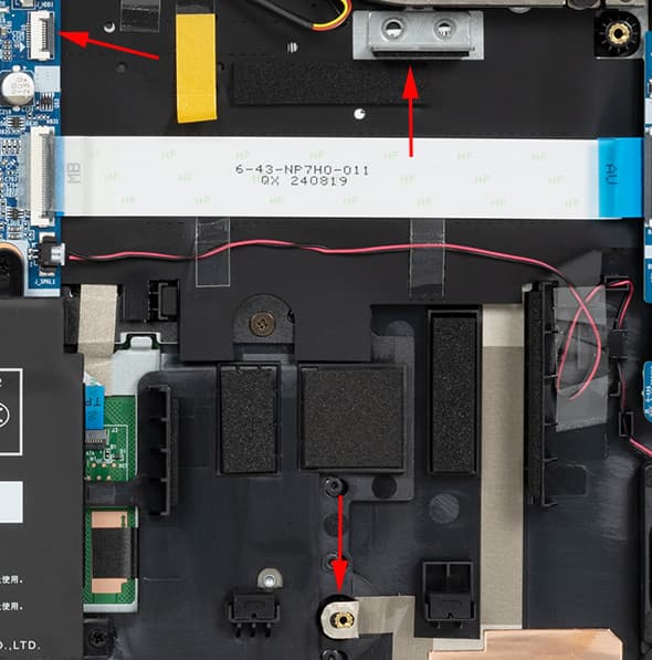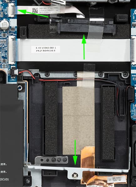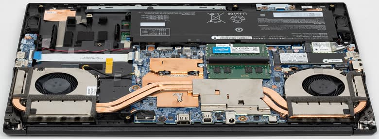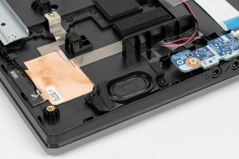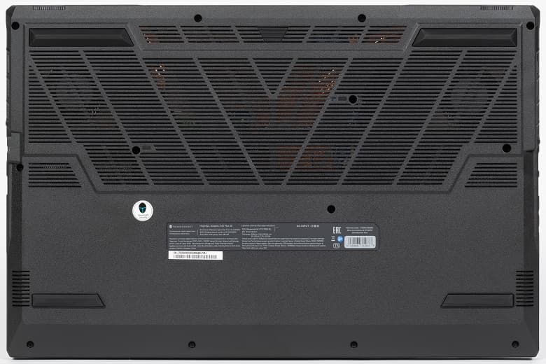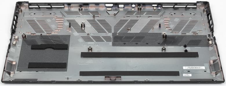 На днище, кроме четырёх продолговатых ножек, ближе к задней кромке имеется большая решётчатая область, через которую происходит забор воздуха для охлаждения компонентов, поэтому ставить ноутбук на мягкую поверхность не следует.
