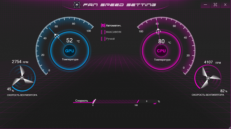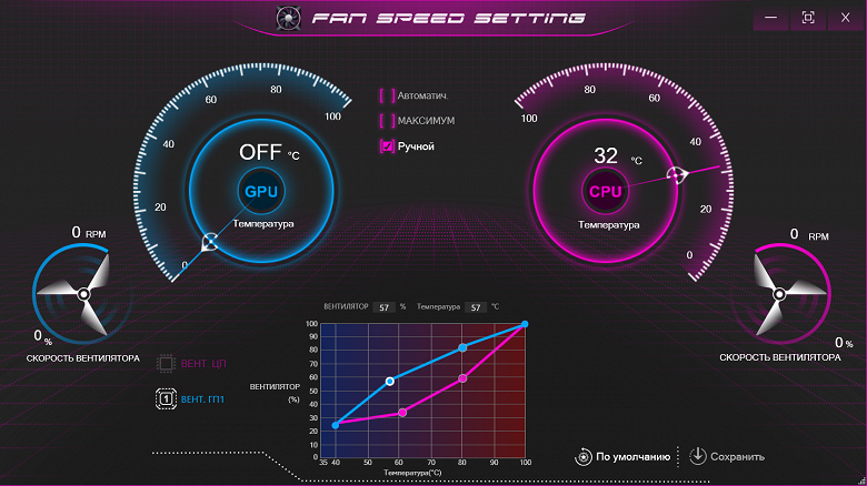 Fan Speed Control позволит выбрать режим работы вентиляторов: автоматический (но можно задать минимальное значение для кулера CPU), постоянная максимальная скорость для обоих вентиляторов (4800-4900 оборотов в минуту, шум получается соответствующий) и ручное задание профилей (в виде кривых) для каждого из них. При этом отображаются текущие значения для температуры CPU и GPU, а также для скоростей вращения их вентиляторов в величинах абсолютных и относительных (проценты от максимума).