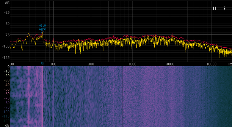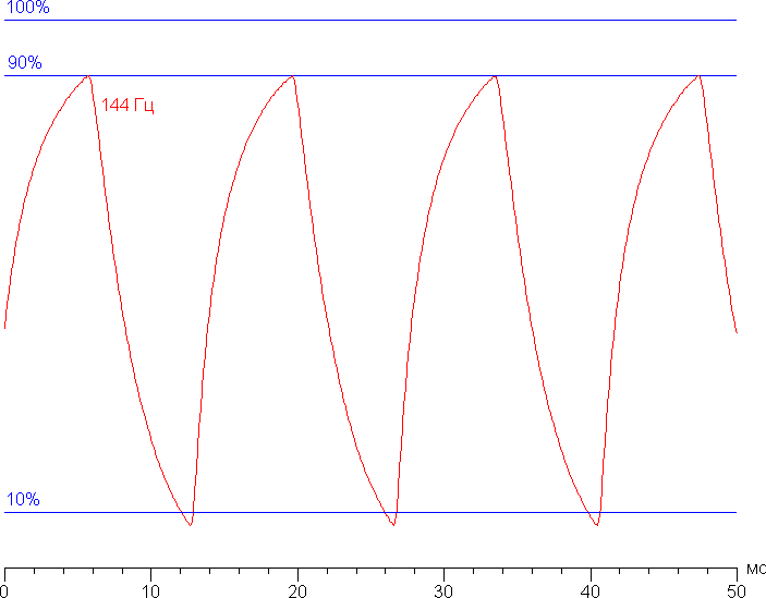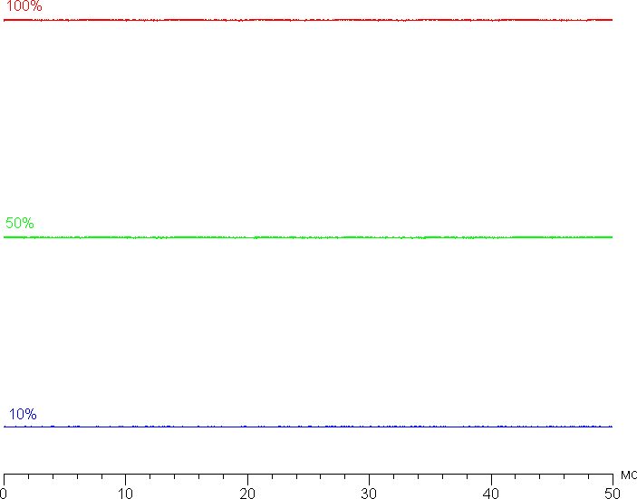 На любом уровне яркости значимая модуляция подсветки отсутствует, поэтому нет и никакого мерцания экрана (нет ШИМ). В доказательство приведем графики зависимости яркости (вертикальная ось) от времени (горизонтальная ось) при различных значениях настройки яркости: