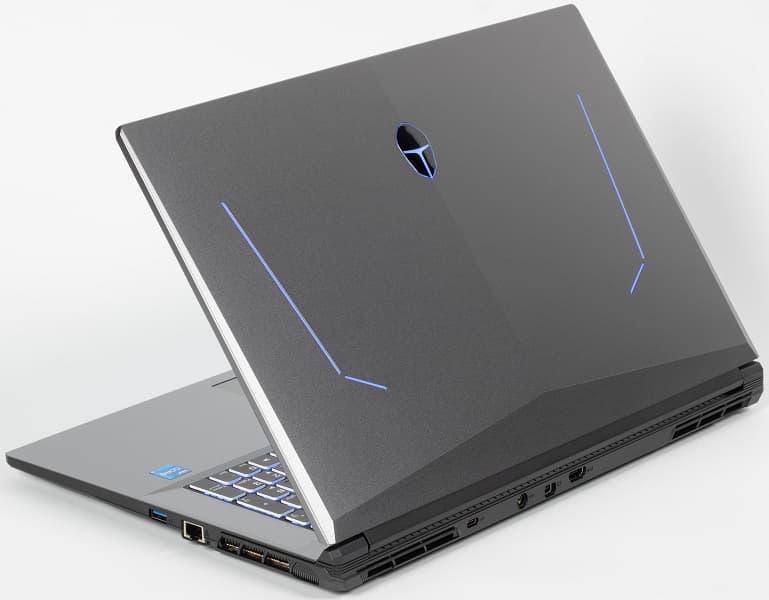 Оформление корпуса для игрового ноутбука скорее строгое: серого цвета внешние поверхности и элементы, чёрные низ и задняя кромка, прямые грани и минимум декоративных элементов. Сделанная из алюминиевого сплава верхняя часть крышки с экраном слегка выпуклая, едва заметный рельеф подчёркивается двумя тонкими линиями с изгибом, которые при включённом питании подсвечиваются голубым. Щиток логотипа на этой крышке имеет подсветку того же цвета.