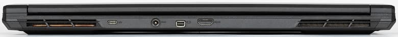 На заднем торце имеются гнездо питания, порты HDMI (полноразмерный), DisplayPort (mini) и USB3 Gen2 Type-C (без поддержки Power Delivery и вывода видеосигнала).