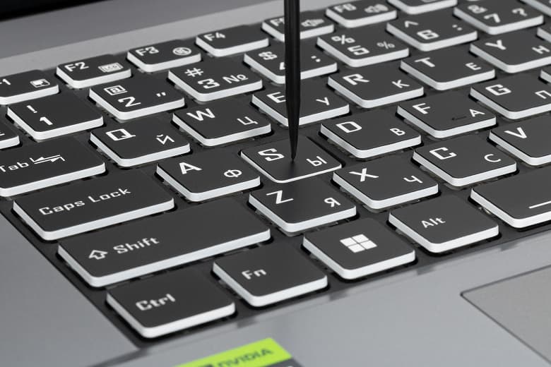 Большинство клавиш имеют чуть уменьшенный по сравнению с обычным для ноутбуков размер 14,8×14,8 мм, функциональные ещё поменьше (13,3×9,8 мм), левая Shift шире правой: 35 и 24 мм соответственно, а Enter довольно большая – 33×14,8 мм. Все четыре клавиши со стрелками имеют нормальный размер. Зазоры между рядами и кнопками в ряду по 3,5 мм.