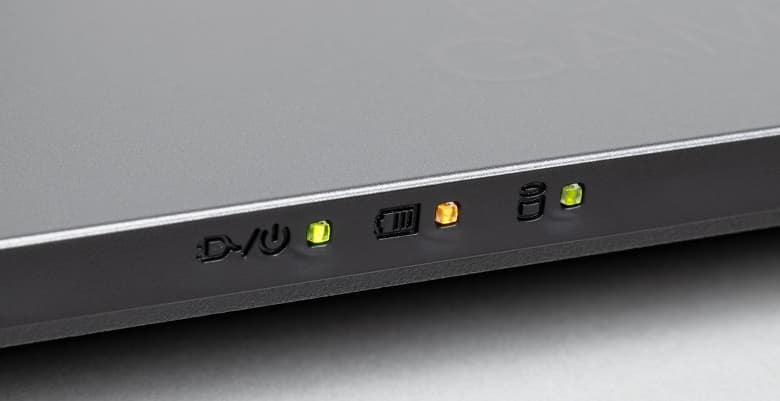 На передней кромке имеются три индикатора: левый свидетельствует о подключении внешнего питания, средний указывает на состояние батареи, а правый отображает активность накопителя.