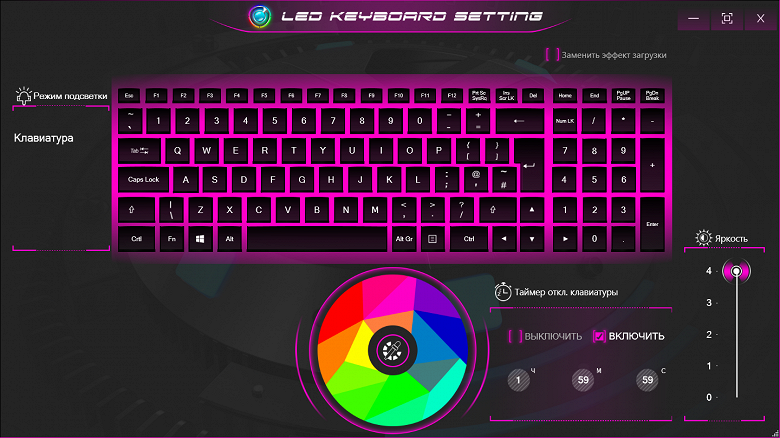 LED Keyboard управляет подсветкой клавиатуры: позволяет выбрать цвет (правда, какие-либо эффекты не предусмотрены) и яркость (четыре уровня и выключено), а также задействовать автоотключение через интервал, задаваемый в пределах до 1 часа 59 минут 59 секунд. Подсветку декоративных элементов внешней стороны крышки с экраном эти установки не затрагивают, отключить её нельзя – в имеющейся версии утилиты подобного мы не нашли.