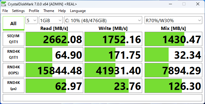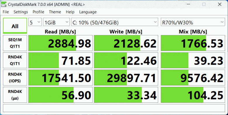 Установленный в Thunderobot 911 Plus SE накопитель проявил себя неплохо – чуть хуже, чем использованный в Maibenben X17A, но гораздо лучше, чем в двух других моделях Thunderobot, причём во всех четырёх ноутбуках используются SSD NVMe PCIe 4.0 ×4.